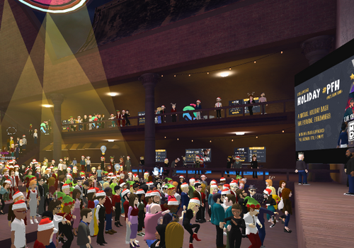 Other speakers followed Peter to talk about recent XPRIZE initiatives, and then Peter directed participants to break into small groups to brainstorm some questions they'd like to pose to the speakers. In large online gatherings like this, breaking into small groups can sometimes be a logistical challenge, but 3D worlds like VirBELA make it easy. People simply walked to one of the many private voice zones that were set up inside the auditorium in VirBELA. That way, dozens of separate conversations were happening at the same time, while everyone maintained a sense of space and togetherness with the other participants.